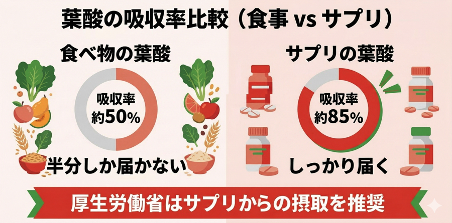 でも食べ物の葉酸は体に半分しか届きません。サプリなら約85%届くから、毎日安心です。