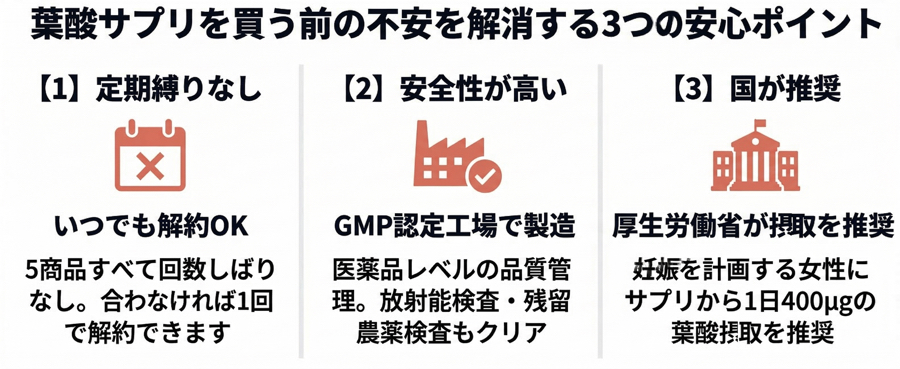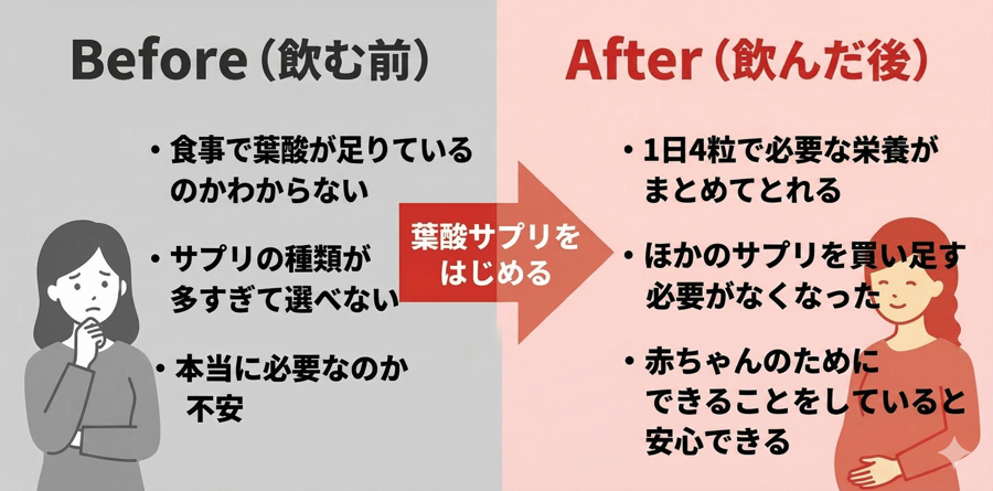 - 「葉酸だけじゃなく鉄やカルシウムもまとめてとれるから、ほかのサプリを買い足さなくてよくなった」